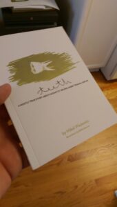 Oh, right, it’s “accomplished.”That word makes me feel like a part of my brain fell off and is now rattling around inside my head so that whenever I hear it, the sound of the word is overwhelmed by the perceived rattling of a chunk of flesh against my skull.Not that I think this little book I am holding in my hand is not kind of cool. But let’s be honest. I’ve not even managed to update this blog in years and I’ve been known to spend whole weekends watching YouTube videos. I’ve never adopted a “writing schedule” and I am totally unable to quote passages from my favorite books.But look at that: a book I made. Without necessarily holding on to some traditionalist view of what it means to be a writer. There it is. And when I first saw it, I burst into tears.You see, I grew up pretending I was going to be a writer. I copied movie scripts and fictionalized them at age 12. I wrote horrible poetry–as we all do–at age 16. I crafted two novels in college and in my 20s that, even judging now, weren’t so bad. But writing as a way of life or a profession takes certain elements and character traits I simply don’t possess. I realize now a big chunk of that is the complete lack of financial security being a writer entails. But THAT is an entirely different post.What I will say is that I am full of good ideas that never come to fruition. And I suppose many people who pursue any kind of creativity–whatever that means for them–would say the same.That little book in my hand was an idea that showed up in the chunk of my brain not rattling around against my skull about 10 years ago. I had written these three weird stories/essays about death because I was going to put together a book proposal and sell it to an agent and then to a publisher and I was going to spark some trend and someone was going to pay me a high five-figure advance because they believed they could sell me to The New York Times, Oprah, or at least Mental Floss magazine. But. But. But. Wait.I’d worked in book publishing. I knew how this would go if I went down this path. And it was not how I wanted it to go. I didn’t want to have to do this…song and dance…about what it “meant to be a writer.” I didn’t want to hope that selling myself meant finding someone “sympatico” or even sympathetic.I looked to a musician whose work I very much admired as an inspiration. She had left her record label behind and decided to be entirely listener supported. I couldn’t do that of course since I did not have 20 years of audience support. But I could find a way to make the book or books I wanted. Surely. What I lacked in financial resources I made up in my personal relationships. It turns out that when you tell people of an idea you have, they *support* you and they might even want to be *involved* in it. My muses were my friends, ex-lovers, co-workers, casual acquaintances. I did my own grassroots PR for so long talking about these little books that when it came time to actually finish this first one, I knew exactly what to do.I realize now I had some living I needed to do in order to make books about the dead.I needed to know exactly how to say what I wanted.I needed to be comfortable with saying no. And yes. And I don’t know.It still took a few years past this point of having friends work in their spare time. Of fretting over a story tweak. Of wondering if this was just a vanity project by a middle-aged man. There are much worse vanity projects to have, let’s be honest. And vanity is still the hope of telling a good story. Of showing how talented my friends–and artists in their own rights–are. Of wanting to share stories.So I don’t see it as an accomplishment per se. To me it was meant to be in one way or the other. And now it gets to be more than just something I told you once upon a time. It’s an object. A story. A collaboration. A labor. A wish. A lark. A book.xo-M -